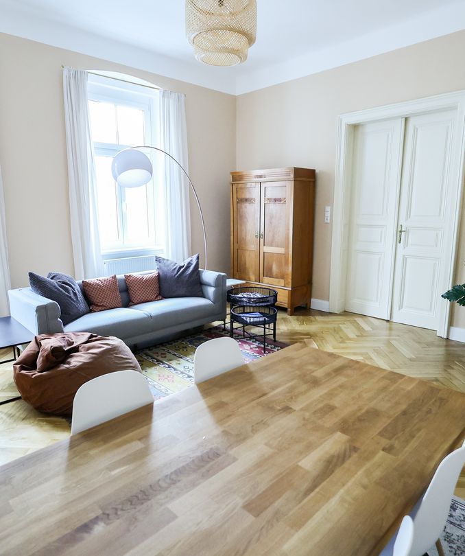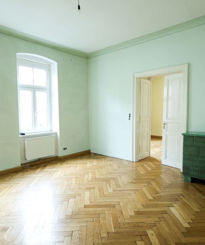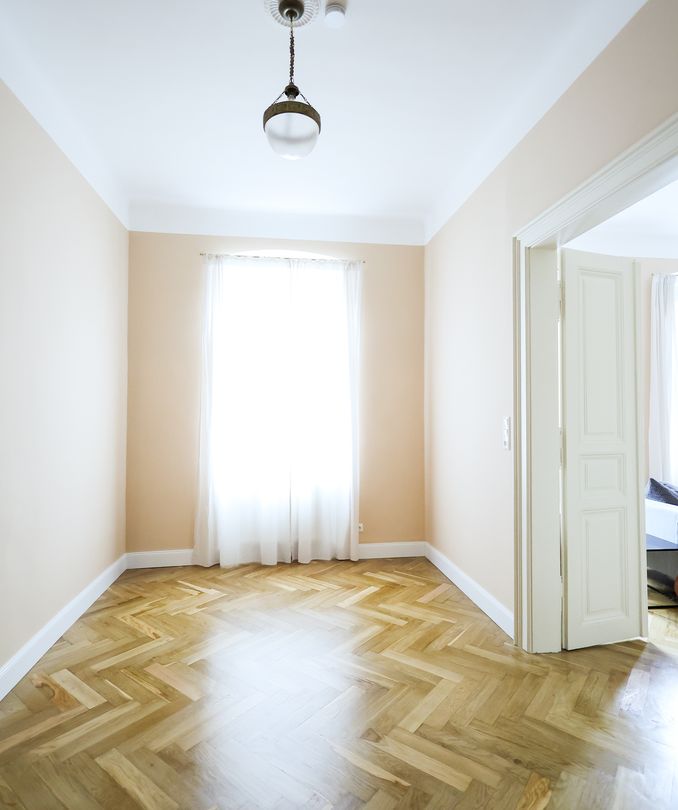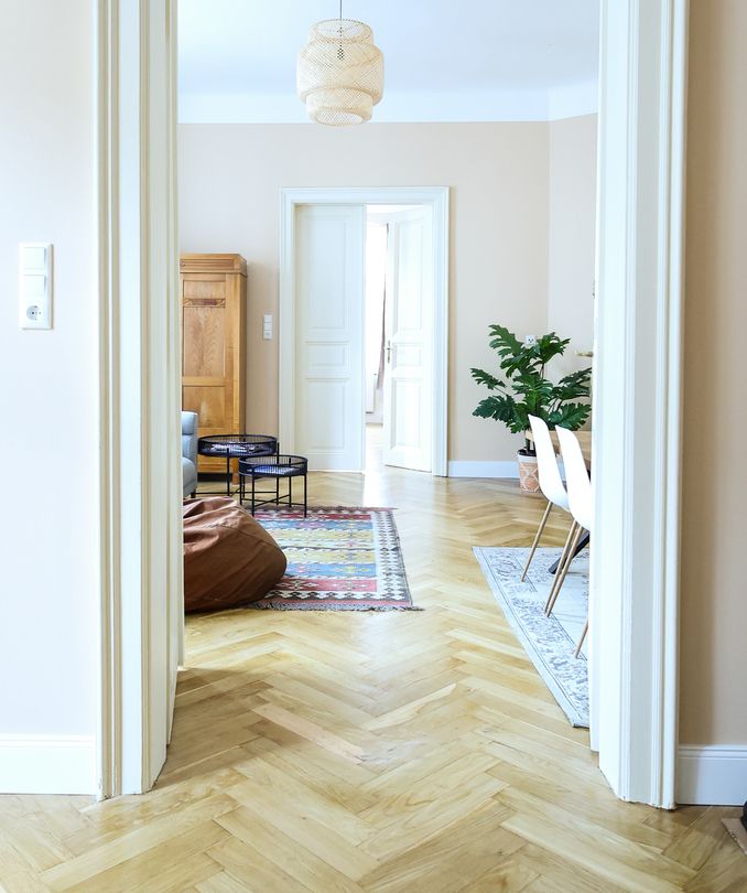 Ein besonderes Augenmerk legten wir auf den Erhalt des charaktervollen Fischgrätparkettboden. Um dessen natürliche Schönheit und Robustheit wiederherzustellen, haben wir ihn sorgfältig geschliffen und versiegelt. Durch diese Maßnahmen wurde der Charme des alten Parketts nicht nur bewahrt, sondern auch restauriert, sodass er nun für viele weitere Jahre seine einzigartige Ausstrahlung und Schönheit zeigen kann. Diese sorgfältige Aufbereitung des Fischgrätparkettbodens stellt sicher, dass er als markantes Merkmal der Wohnung erhalten bleibt und weiterhin zur Ästhetik und Atmosphäre des Raumes beiträgt.