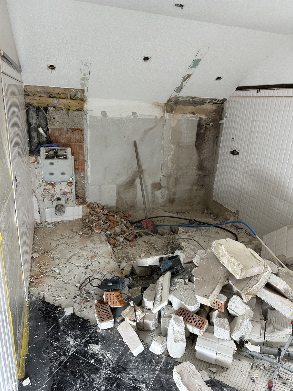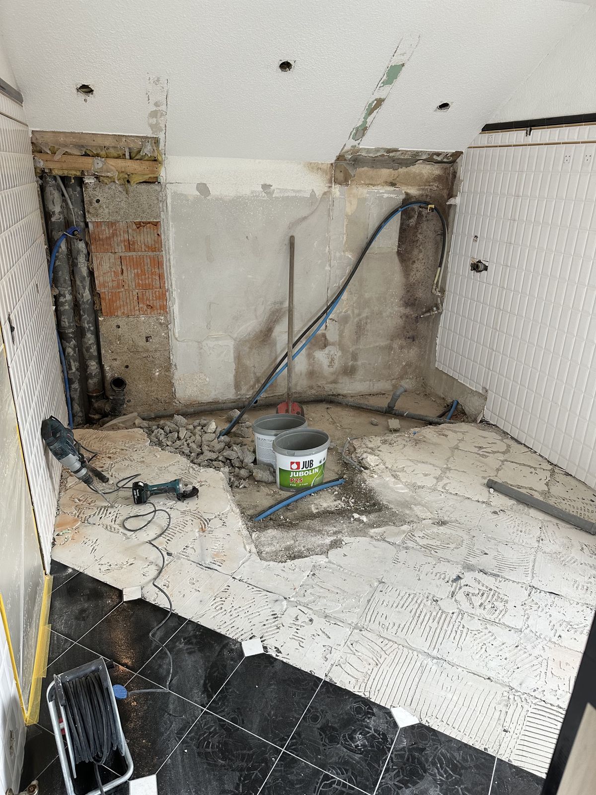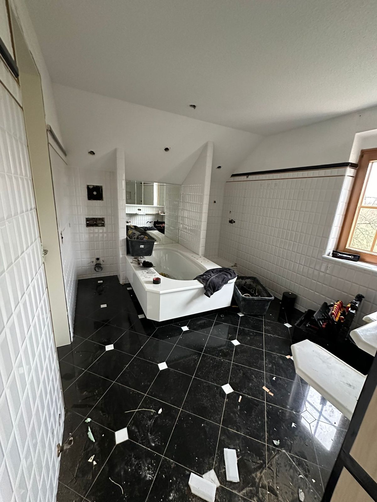 Während der Sanierungsarbeiten legten wir großen Wert darauf, dass angrenzende Räume weiterhin genutzt werden konnten. Durch sorgfältige Abdeckungen und Schutzmaßnahmen wurden Staub und Schäden während des Abbruchs und Transports der alten Fliesen und Badewanne vermieden.
