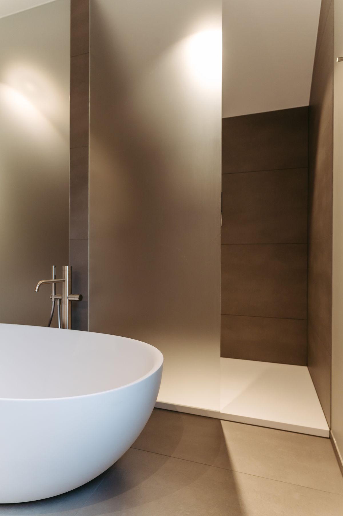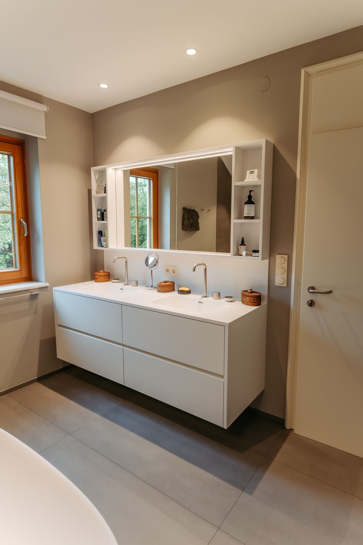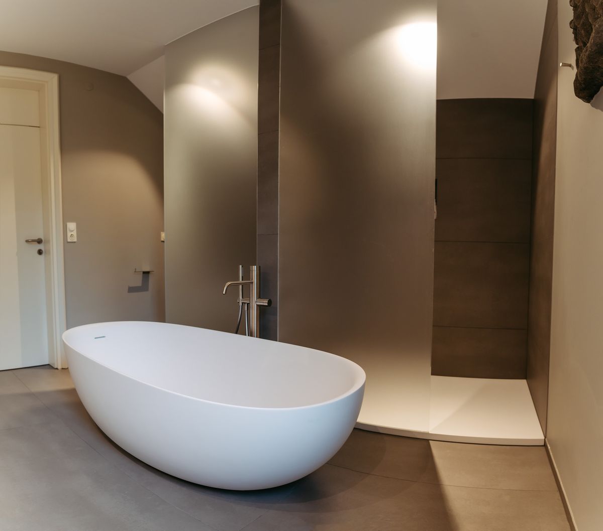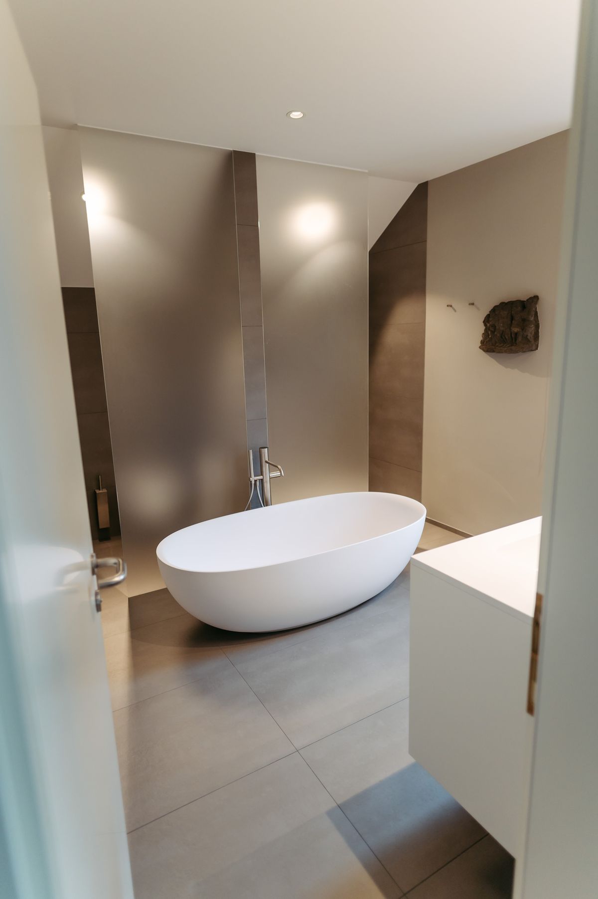Das neue Highlight ist die freistehende Badewanne, die das Zentrum des Raumes bildet und zum Entspannen einlädt. Neben dem WC wurde ein Bidet installiert, um den Komfort zu erhöhen. Der geräumige Waschtisch mit Doppelwaschbecken bietet viel Stauraum und fügt sich nahtlos in das minimalistische Design ein. Alle Arbeiten wurden in enger Zusammenarbeit mit dem Architekten durchgeführt, um Funktionalität und Ästhetik optimal zu verbinden.