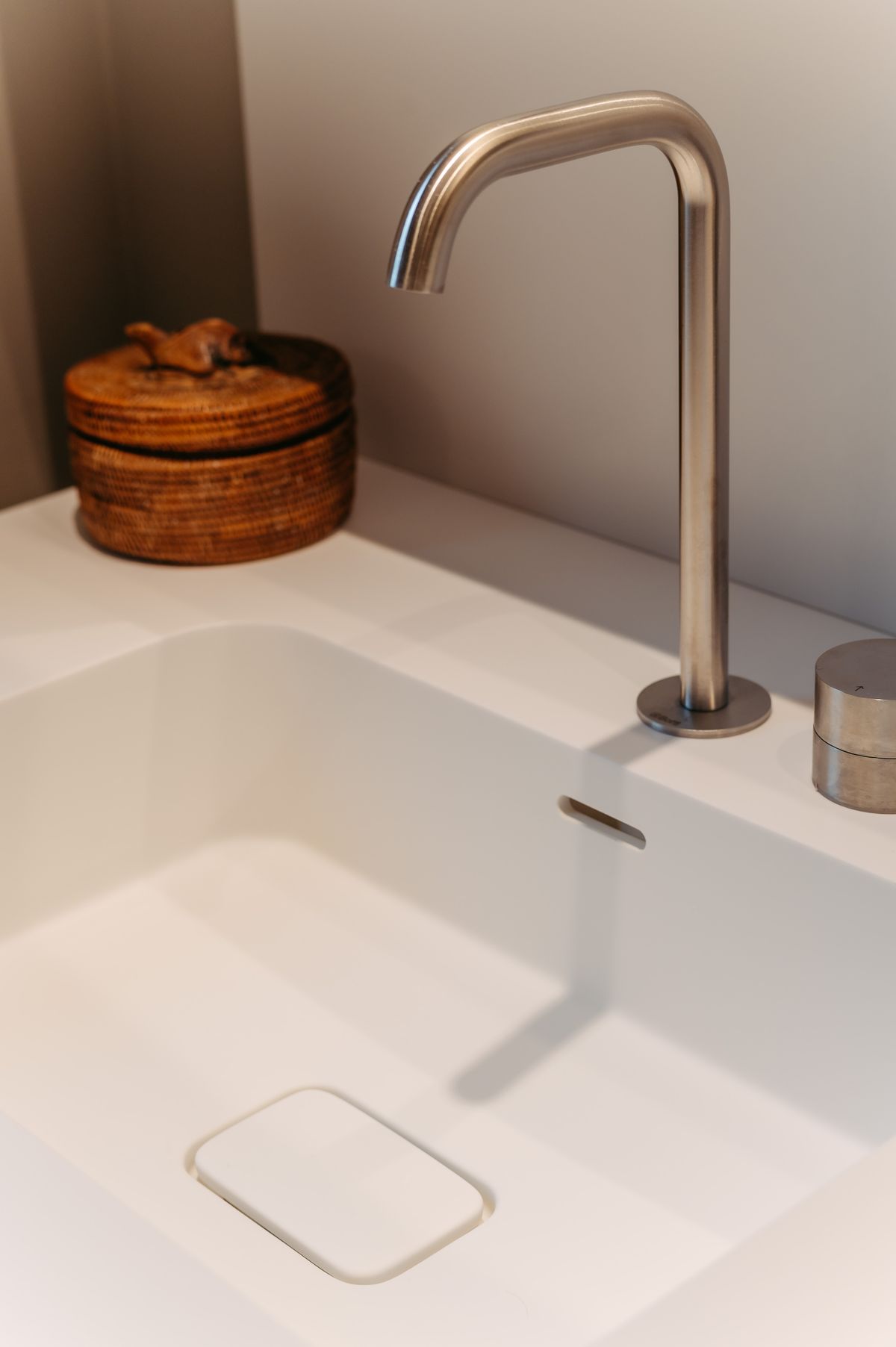 Durch eine umfassende Sanierung wurde das alte Bad vollständig entfernt und Platz für ein modernes, stilvolles Design geschaffen. Die neuen Fliesen in warmen Grautönen harmonieren perfekt mit den edlen Armaturen und sorgen für eine ruhige, elegante Atmosphäre.