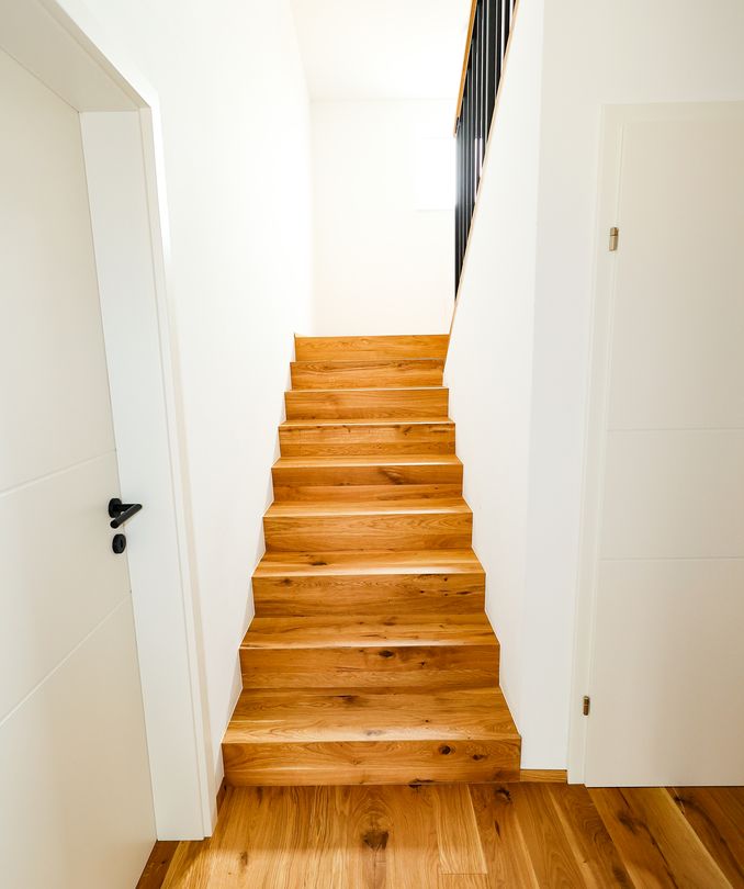In unserem aktuellen Projekt haben wir eine Betontreppe mit maßgefertigten Holzverkleidungen komplett umgestaltet. Dies verbessert sowohl die Optik als auch die Haptik des Raumes. Zusätzlich wurde hochwertiges Parkett in allen Räumen verlegt, was für ein warmes, einladendes Ambiente sorgt und ideal auf die Wünsche unserer Kunden abgestimmt ist.